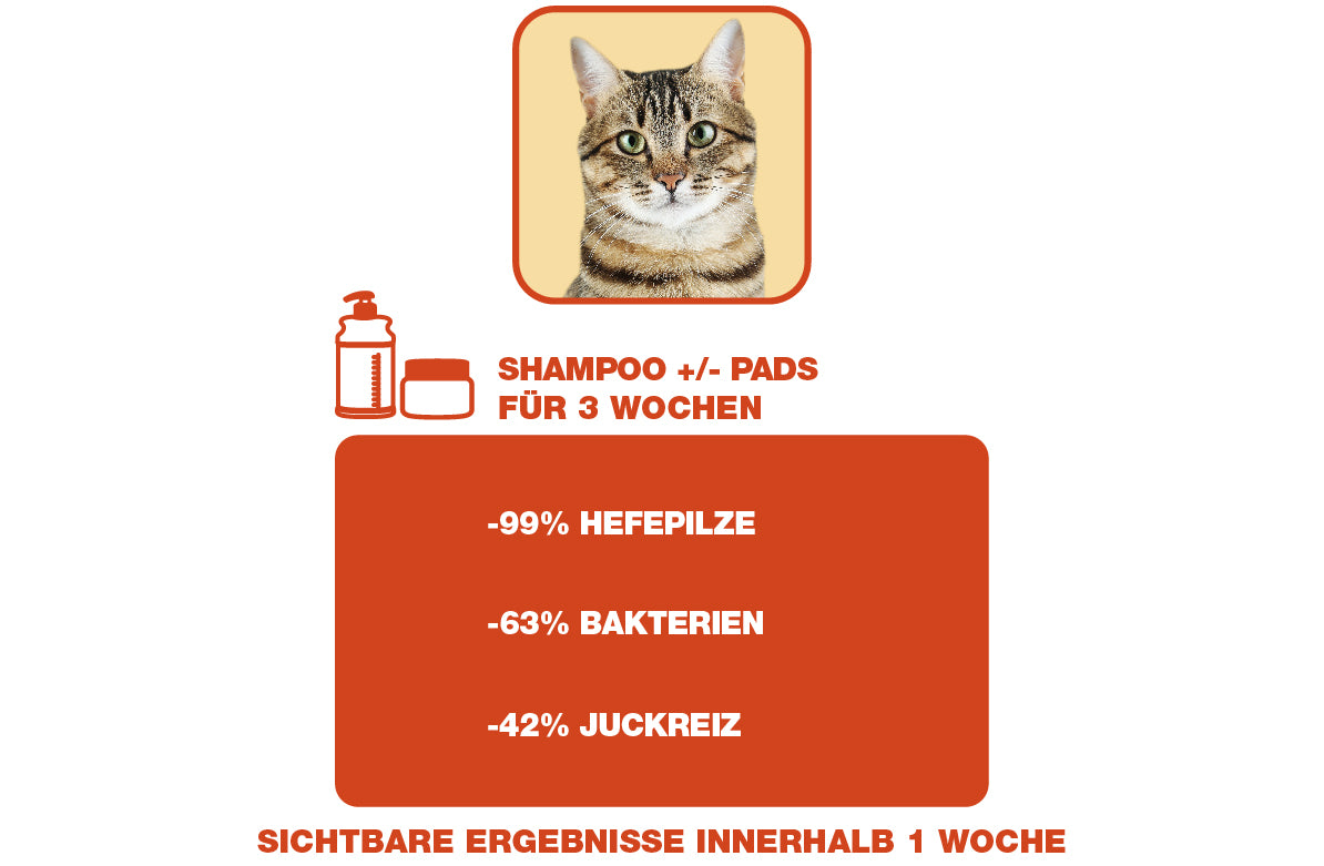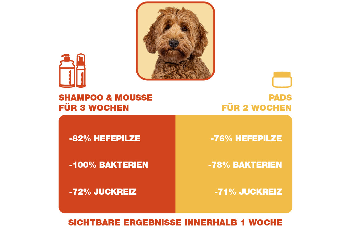 Pilze auf der Haut vermehren sich übermäßig, wenn das Gleichgewicht der Hautmikroflora gestört ist. DOUXO® S3 senkt nachweislich die Anzahl der Hefepilze auf der Haut wieder auf ein normales Niveau ab.